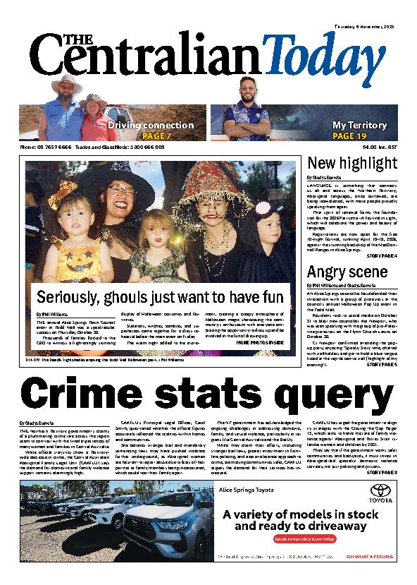 The Centralian Today – 6th November 2025 Subscribe or Login to see the rest of the content. Username Password * Remember Me Forgot Password News Yipirinya kids dive into safety 12/11/2025 Students at Yipirinya School have been making a splash this term, taking part in the Royal Life Saving Swim and Survive Program aimed at... Call for information – Aggravated robbery 12/11/2025 The Northern Territory Police Force is calling for information in relation to an aggravated robbery that occurred on Monday evening, November 10 in Alice... Million dollar boost for Red Centre tourism 12/11/2025 Businesses in the Red Centre will be supported through the launch of a $1 million Alice Springs Revival and Resilience Grant Program, aimed at...