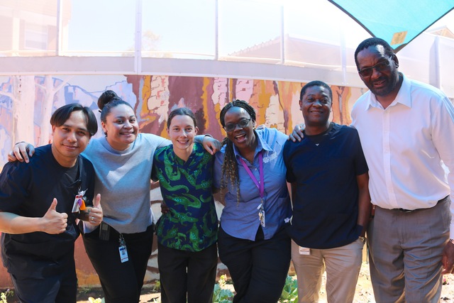 MENTAL HEALTH: Alice Springs Mental Health Unit nurses and doctors celebrating the refurbished facilities with Zues, Toakase, Margo, Porsh, Dr Emmanuel, Ronald. (GLADYS BARRETA: 510946)
