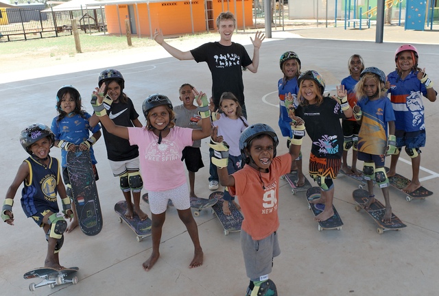 WORKSHOP: Students from Ntaria School with Build Up Skateboards workshop facilitator, Theo.