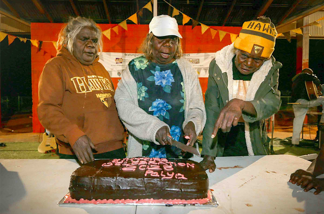 CAKE: PH Director Pilita Naparula Wakuri (left), PH Chairperson Marlene Spencer (middle) and Josephine Napurrula (right) artist of Kintore Women’s Collaborative Painting. (The Purple House)