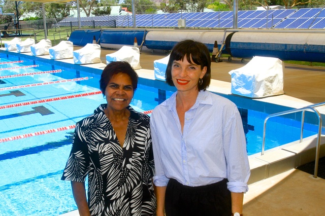 FUNDING: Member for Lingiari, Marion Scrymgour and Mayor Asta Hill at the aquatic centre following the announcement of federal funding for a solar energy upgrade. (PIC: PHIL WILLIAMS 522601_01)