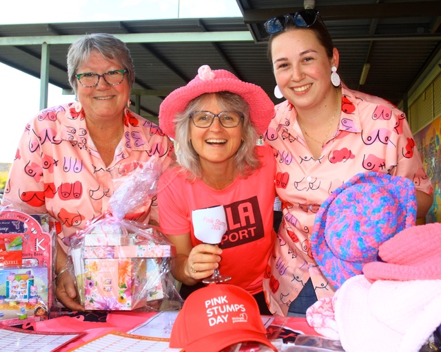 PINK: Leanne Hodge, Virginia Moore and Bridget Hodge show off the Pink Stump merch. (PIC: PHIL WILLIAMS)